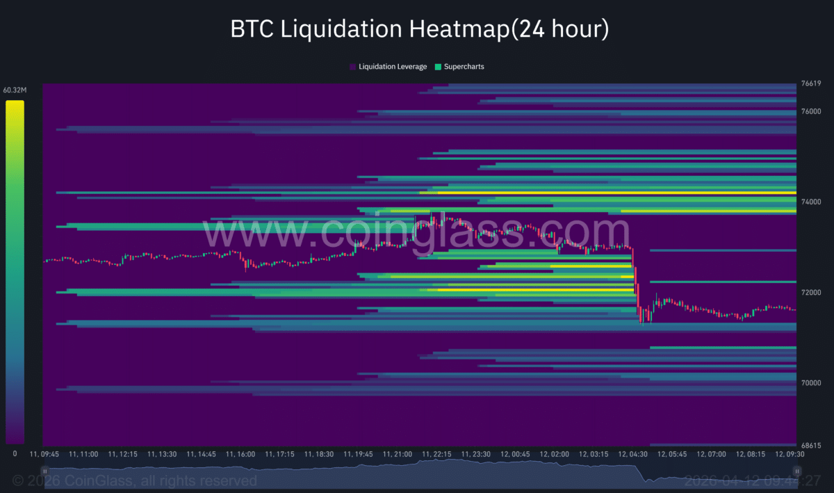Nonetheless, the latest $71,000 rejection highlighted weak spot in follow-through. Costs took benefit of close by liquidity and triggered liquidations, however reversed because of restricted spot demand.